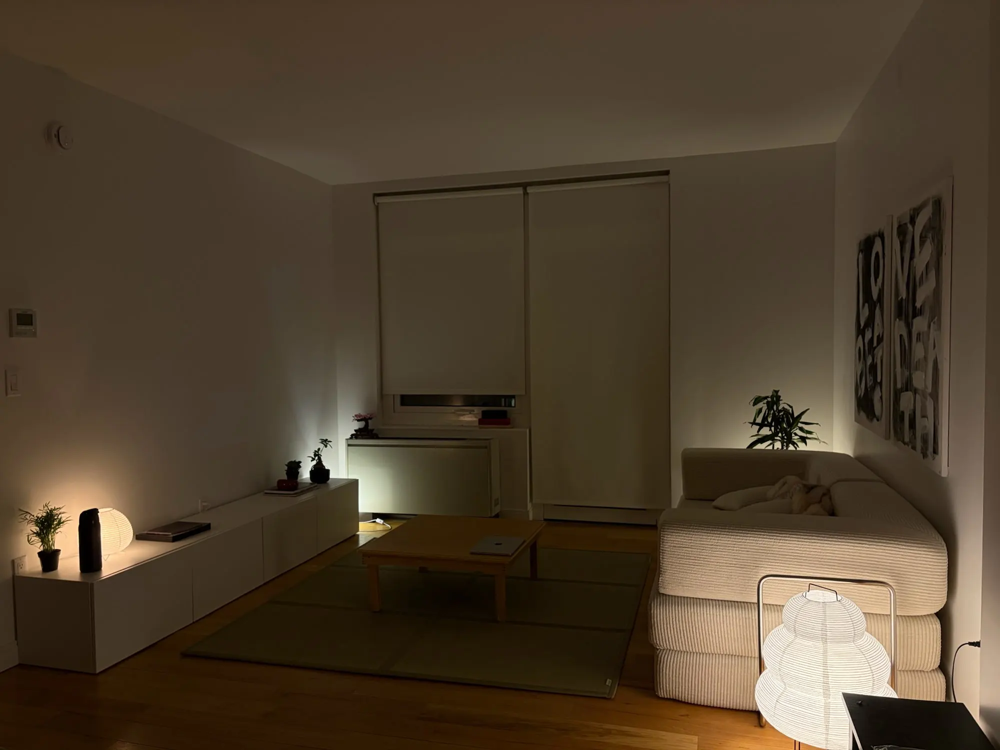 Rice paper shade diffuses light gently, creating a warm and relaxing mood.